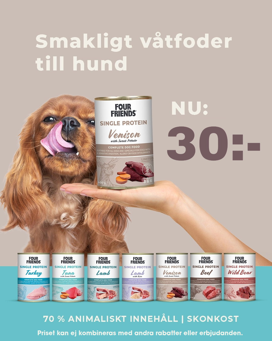 Gäller så långt lagret räcker och alla sorter Four Friends våtfoder 400g. Kan ej kombineras med andra rabatter och erbjudanden.